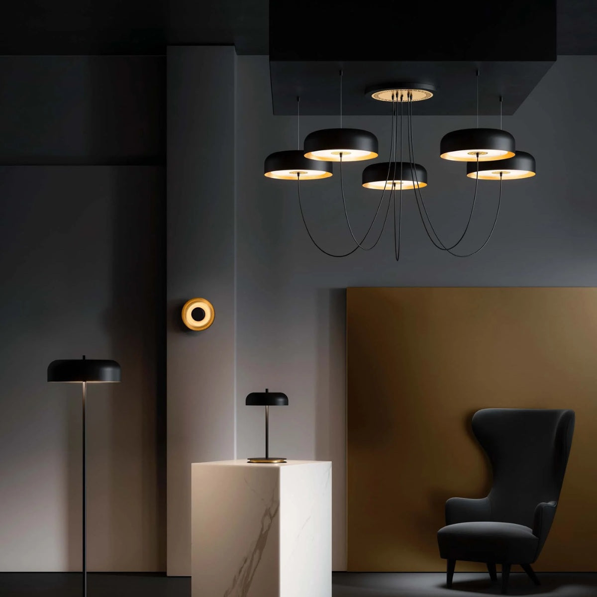 Veeg de lamp voorzichtig af met een droge of lichtvochtige doek. Vermijd agressieve schoonmaakmiddelen om de zwarte en gouden afwerking te beschermen.