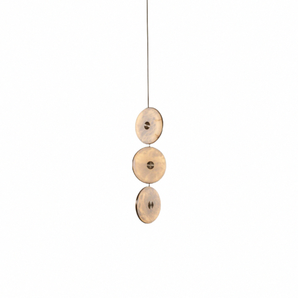 De Bert Frank Beran 3 Klein is een verfijnde hanglamp die op indrukwekkende wijze luxe en ambacht samenbrengt. Het ontwerp combineert drie albasten schijven met warme LED-verlichting, subtiel omlijst door een structuur van massief messing. De zachte gloed van het natuursteen creëert een rustige en elegante sfeer, perfect voor moderne interieurs waarin detail en materiaalbeleving centraal staan.