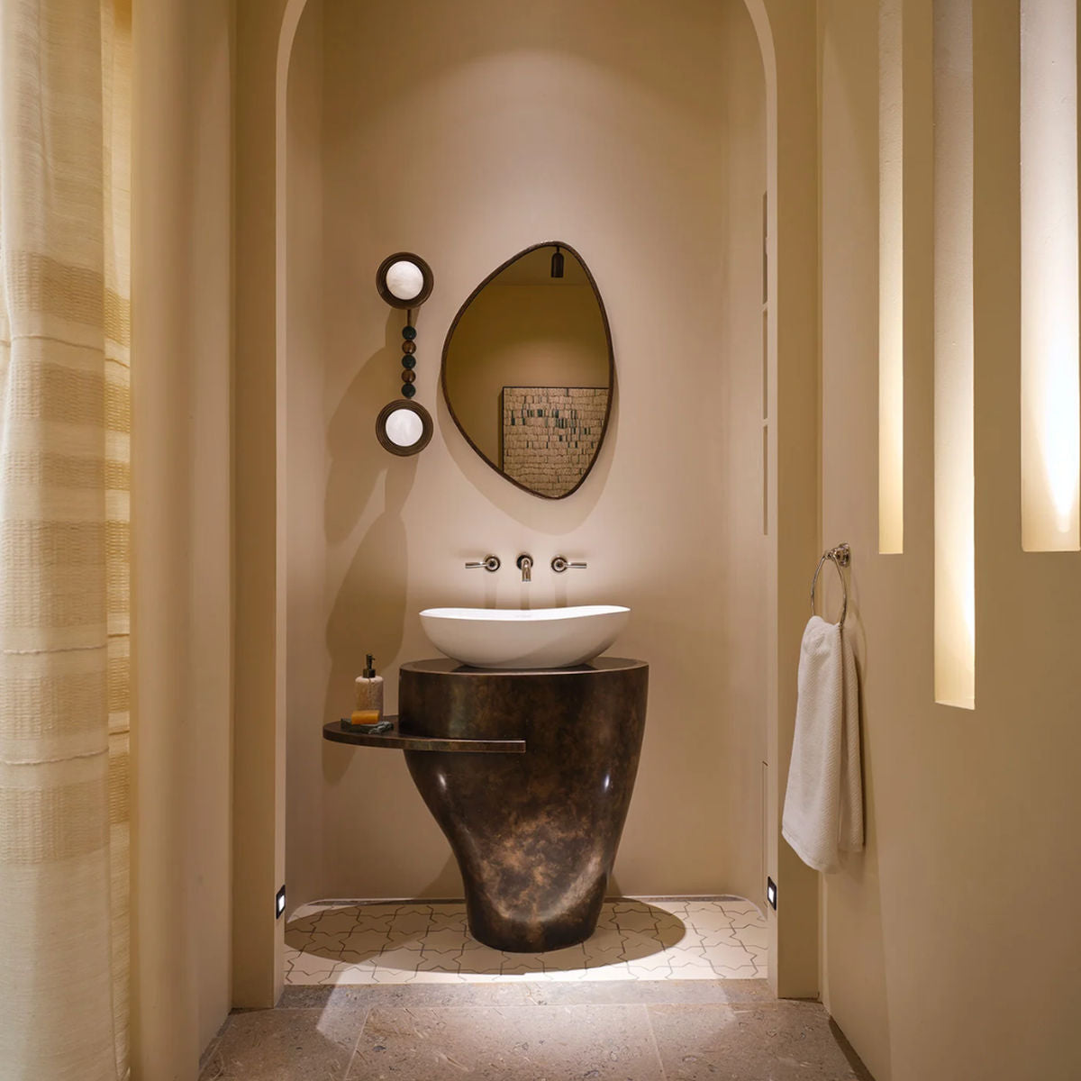 ✔ Luxe materialen – Zandgegoten messing, groen marmer en albast diffusers creëren een tijdloze uitstraling.