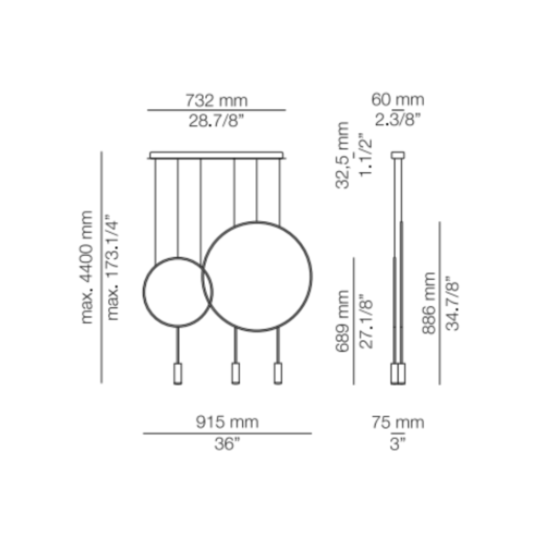 Hanglamp met een cirkelvormig lichaam en twee verschillende diameters. Cilindrische aluminium koppen en acryl (PMMA) lens diffusers. In hoogte verstelbaar. Optionele ombouwset voor acryllens met een hoek van 50º en decoratief geluidsabsorberend paneel.