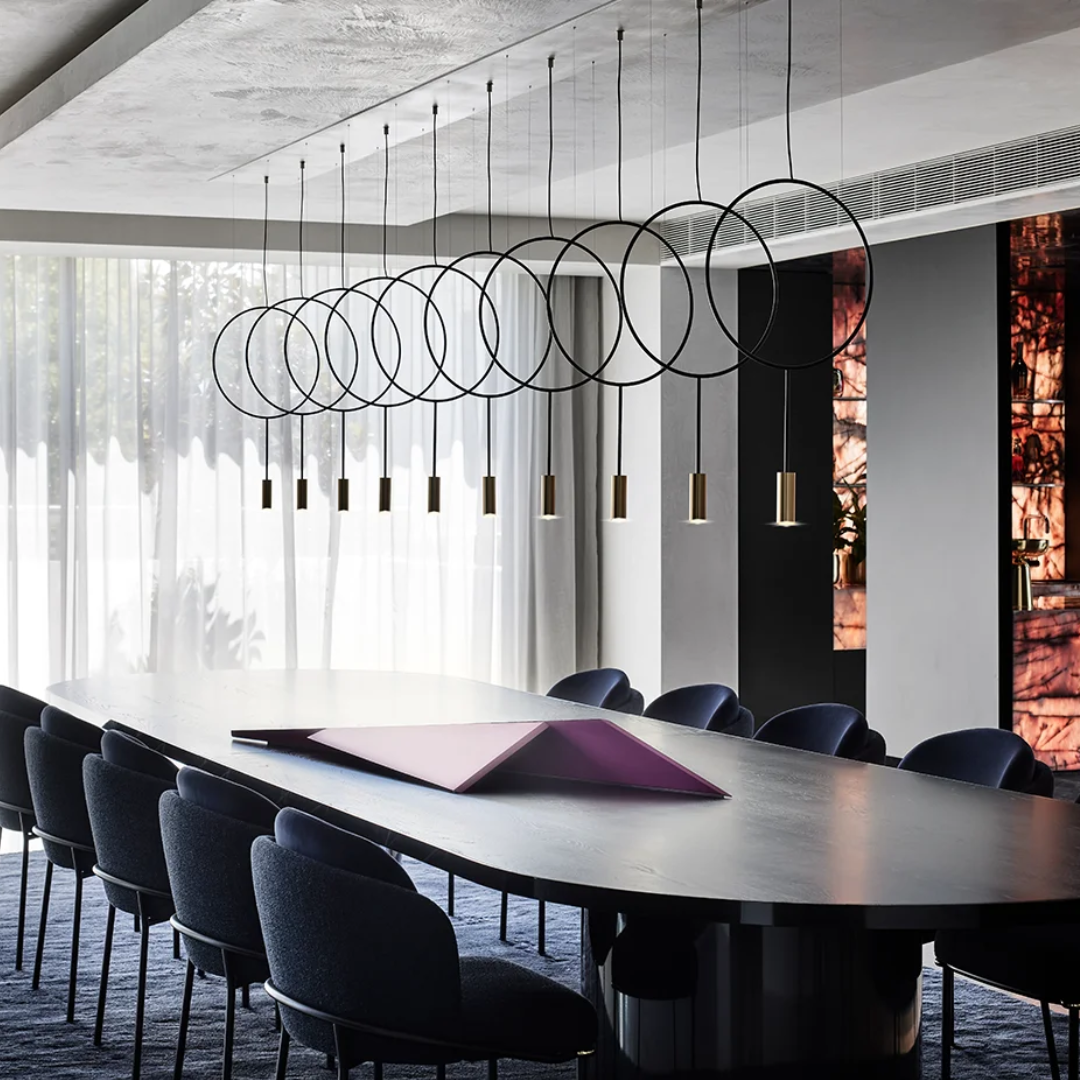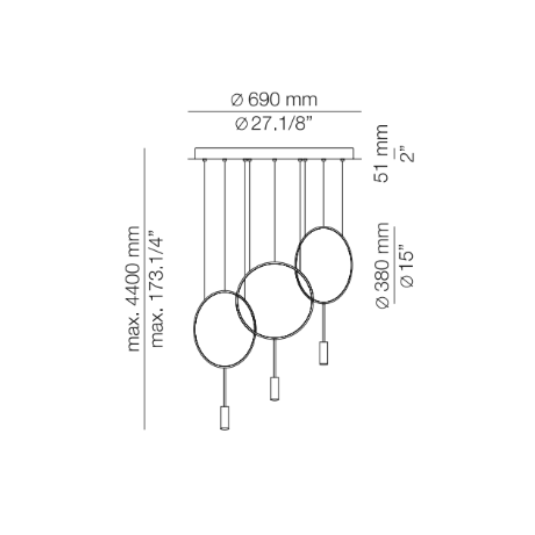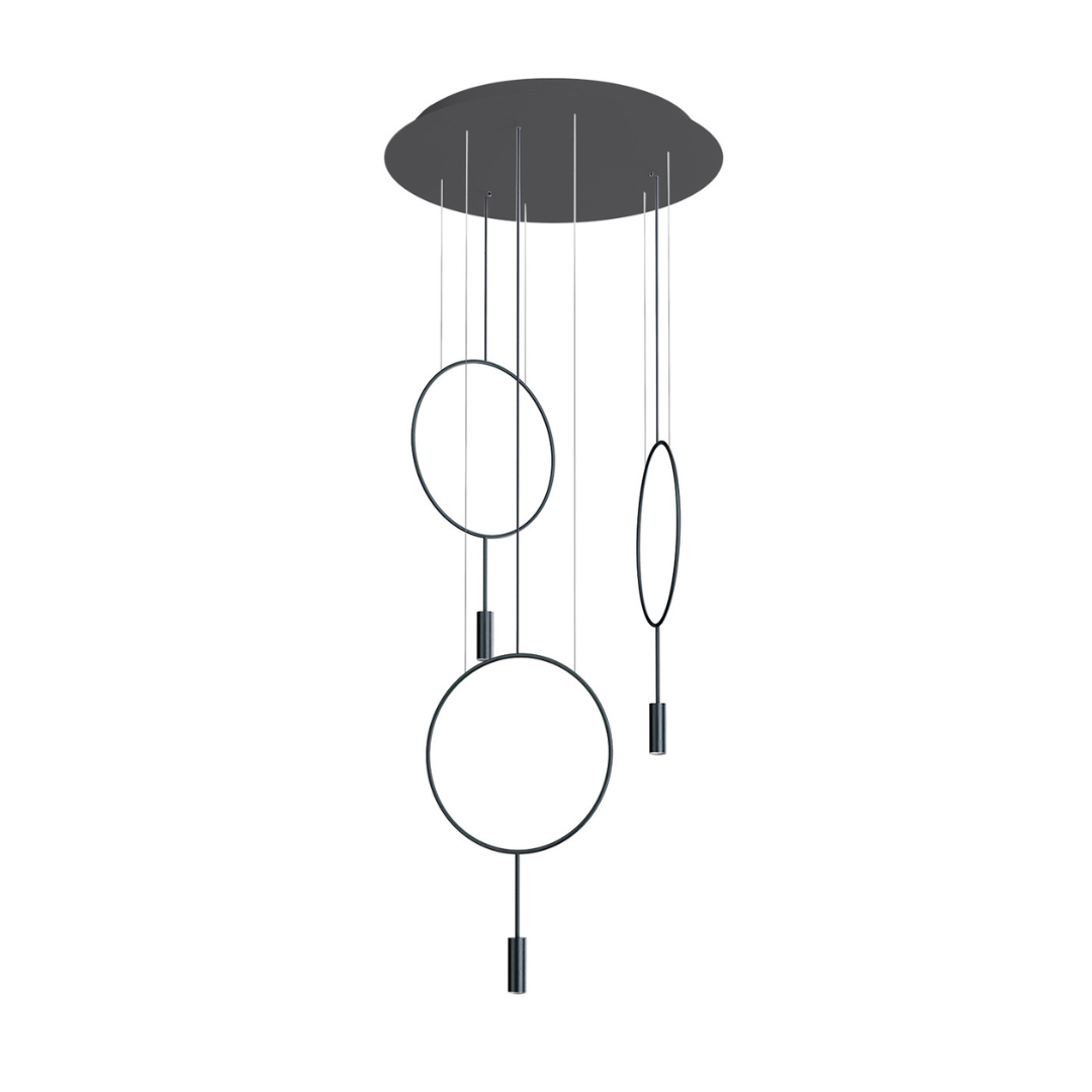 Hanglamp met een cirkelvormig lichaam en twee verschillende diameters. Cilindrische aluminium koppen en acryl (PMMA) lens diffusers. In hoogte verstelbaar. Optionele ombouwset voor acryllens met een hoek van 50º en decoratief geluidsabsorberend paneel.