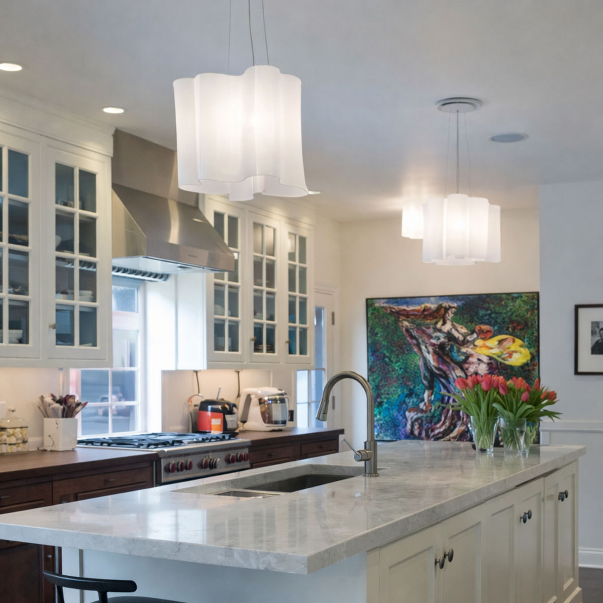 De Artemide Logico Mini hanglamp is een elegante en veelzijdige hanglamp ontworpen door Michele De Lucchi. Dankzij het golvende ontwerp van geblazen glas en de subtiele aluminium accenten brengt deze lamp zowel visuele rust als een krachtig designstatement in de ruimte. De Artemide Logico Mini hanglamp past perfect boven een kleine eettafel, in een hal of als onderdeel van een cluster boven een keukeneiland.