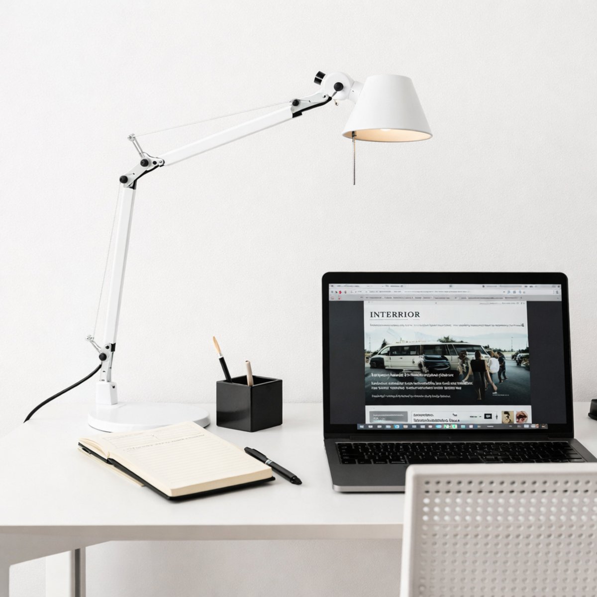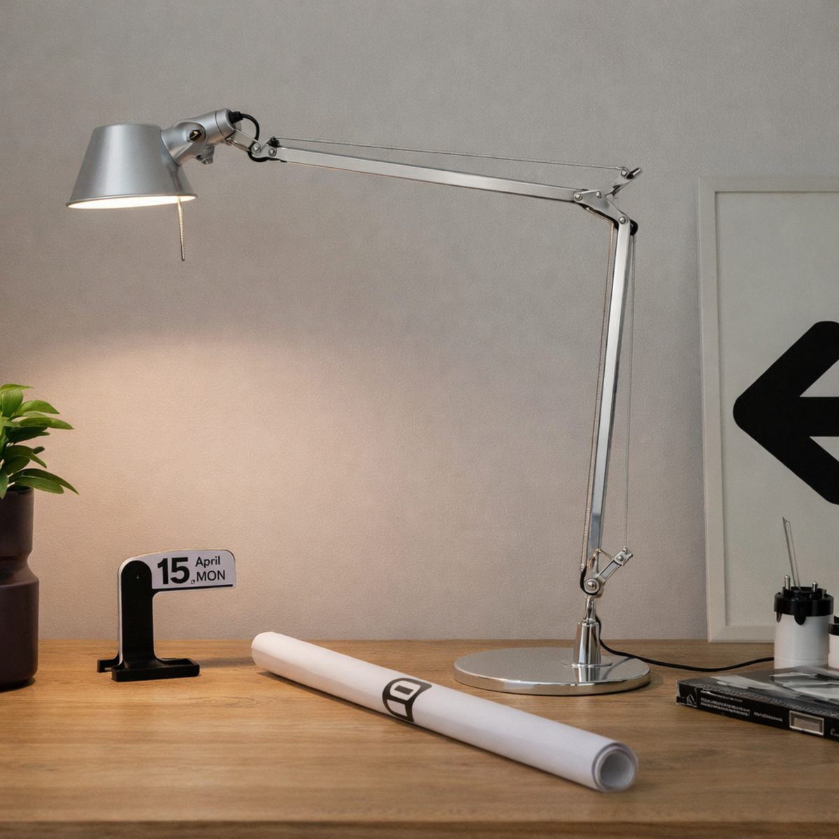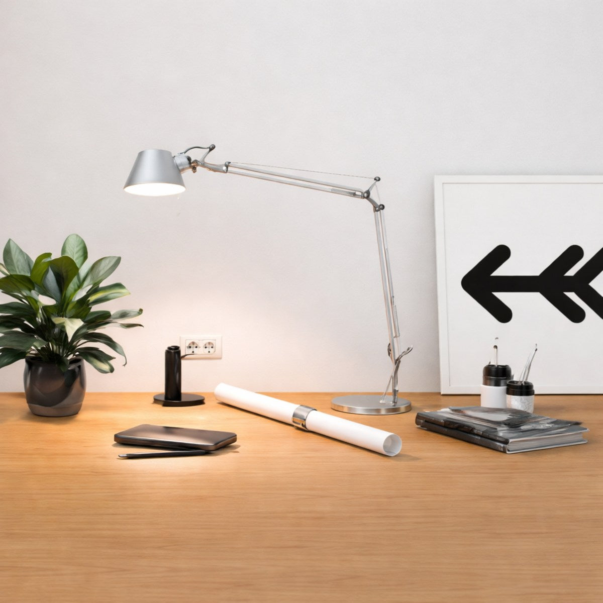 Houd je werkplek verlicht in een strakke stijl met deze wandlamp van Artemide. Het minimalistische ontwerp heeft een flexibele arm en diffuus licht dat je ogen ontziet, zodat je je ongestoord op je werk kunt concentreren. Met een aan-uitschakelaar en...
