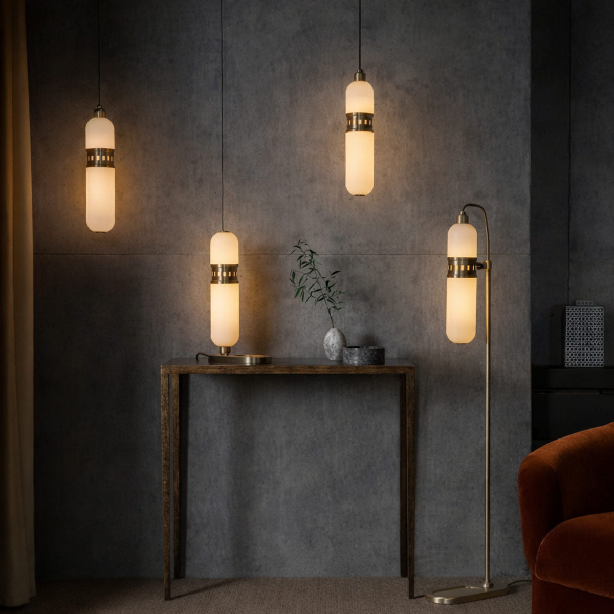 Brace is vernoemd naar de sterke, structurele messing beugel in de kern van het ontwerp.In de eerste schetsen begon Brace als een Afrikaans schild, dat geleidelijk werd teruggeslepen tot deze pure 'pil'-vorm. Elk stuk albast is anders, dus het diffuse...
