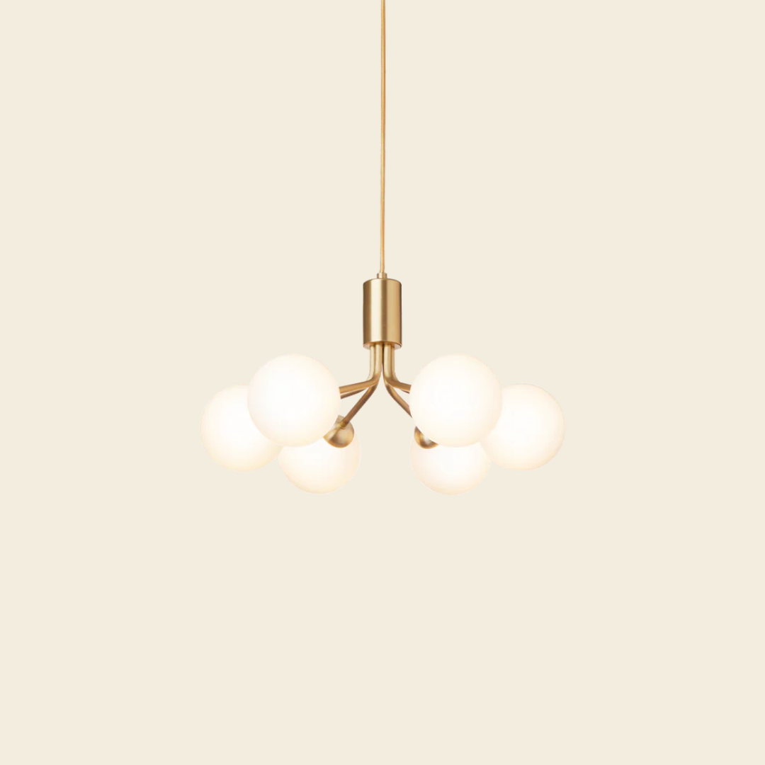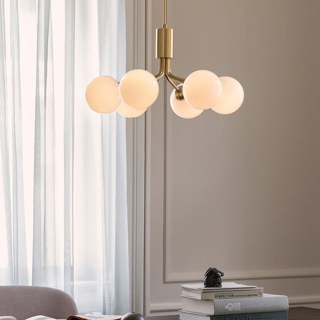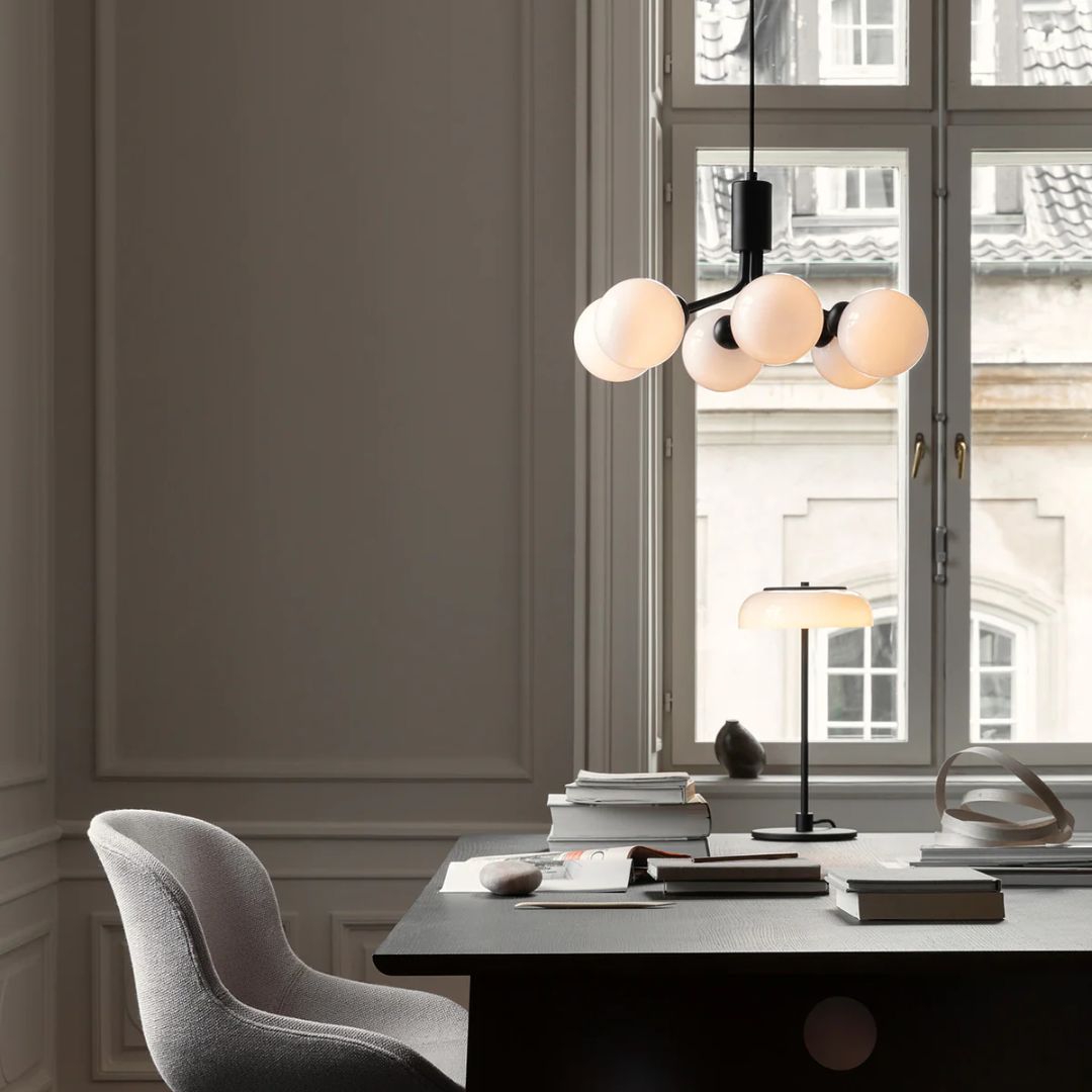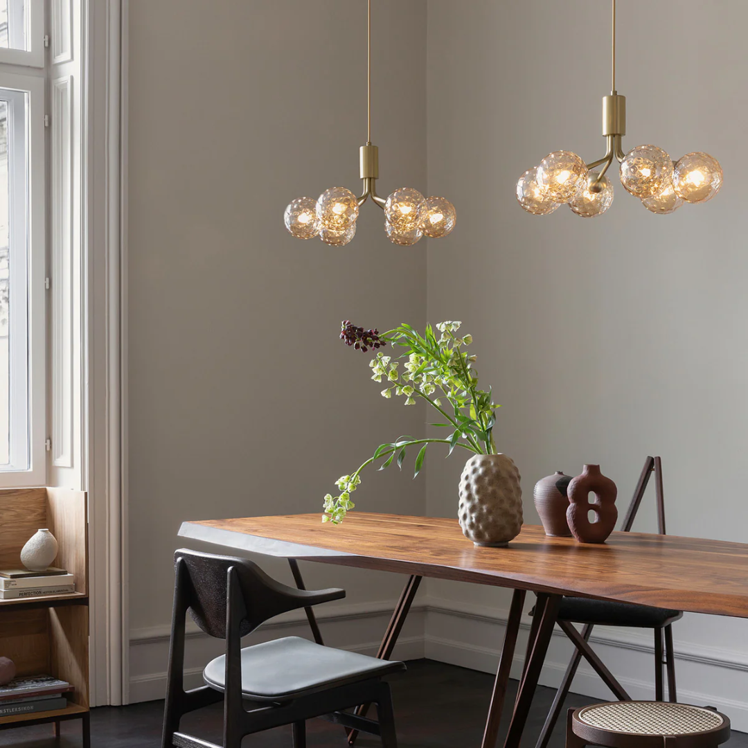 De Nuura Apiales 6 Hanglamp, ontworpen door Sofie Refer, combineert modern Scandinavisch design met een luxe uitstraling. De zes glazen bollen verspreiden een warme, elegante gloed, perfect om sfeer te creëren in woonkamers, eetkamers of hotellobby’s. Het verfijnde ontwerp maakt deze lamp een echte eyecatcher in elk interieur.